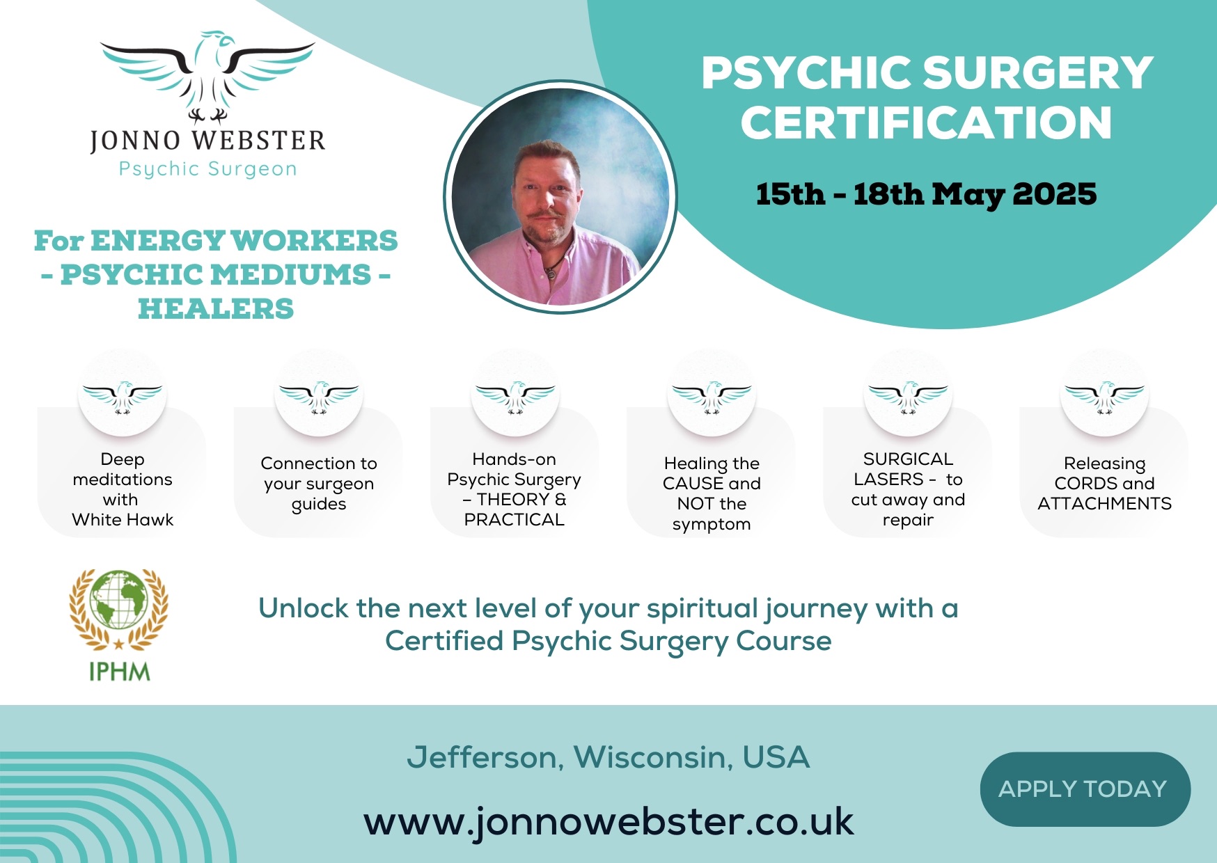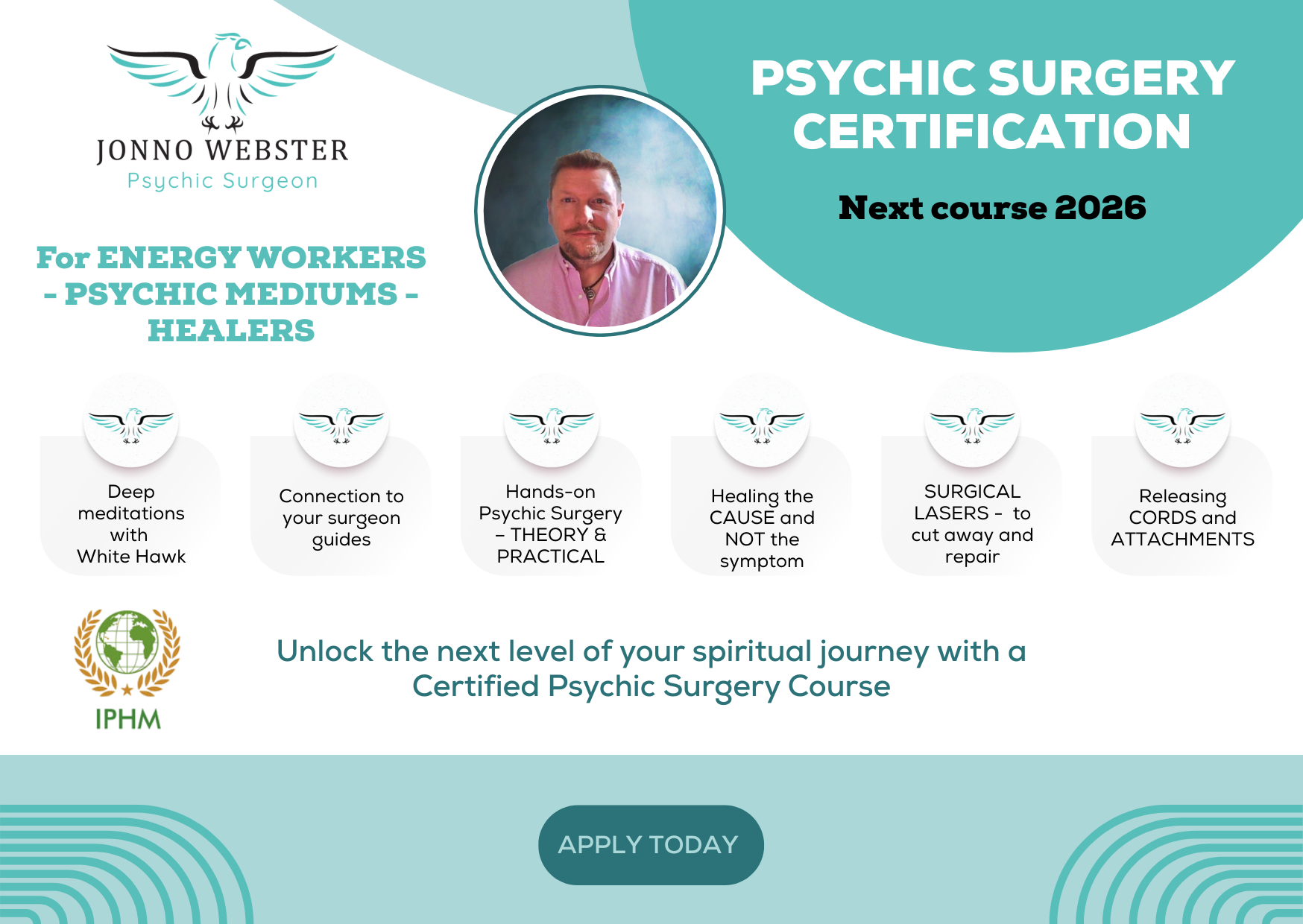 Join Jonno Webster, one of the UK’s leading Trance and Psychic Surgery teachers (IPHM accredited), for this exclusive Certified Psychic Surgery “In-Person” Course. Designed for healers, energy workers, and psychic mediums, this hands-on training will deepen your connection with spirit surgeon guides and refine your healing abilities.